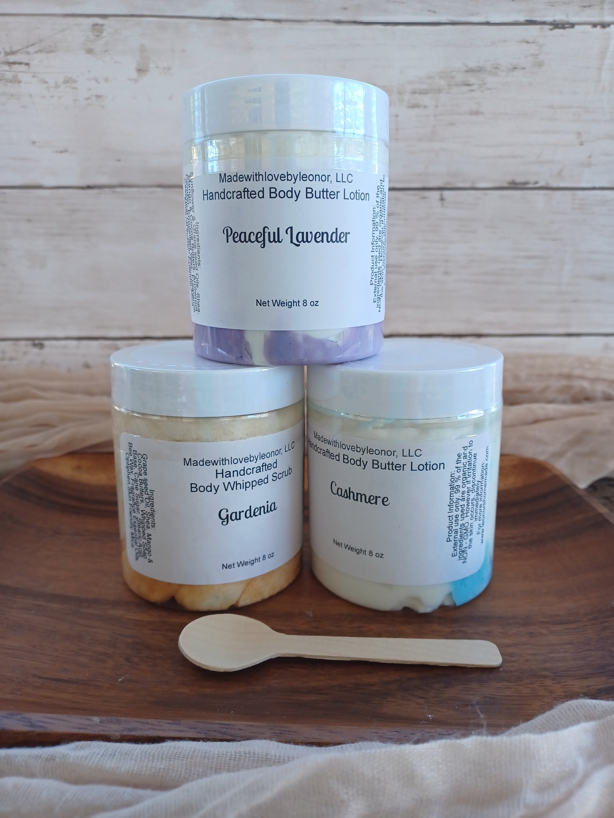 This is a Luxurious Whipped Soap Base Body Scrub reach of Shea, Mango and Cocoa Butters, Oils and Herbs. The texture is creamy and light bubbly, none greasy. Leaving your skin soft and moisturized all day long. It comes in a clear plastic BPA free container with a 2.5 inch spatula/spoon to scoop it out without cross contamination.